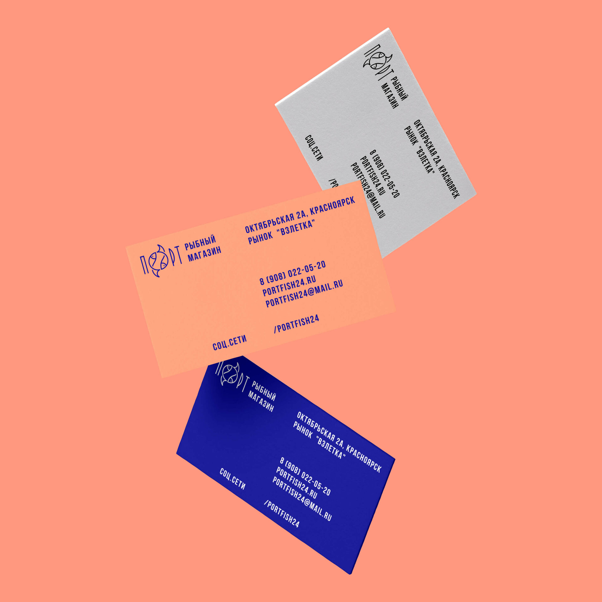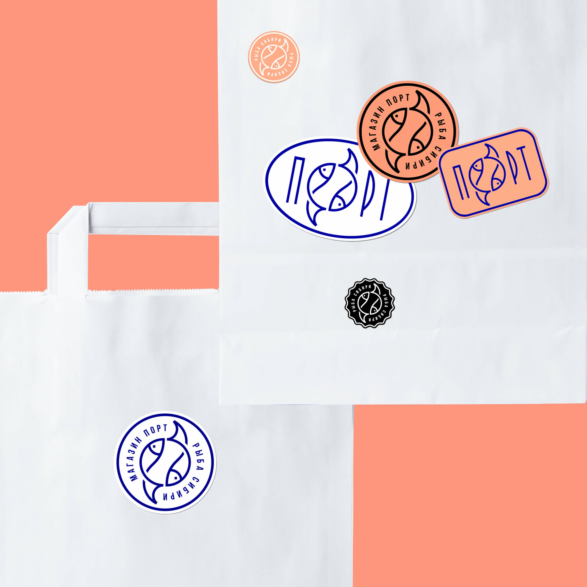 Дизайн логотипа и айдентика для рыбного магазина "Порт" в Красноярске — одного из крупнейших городов России. Составляющая часть логотипа "Порт", основной элемент идентификации и узнаваемости бренда, используется в дизайне фирменных паттернов упаковки и на других носителях.